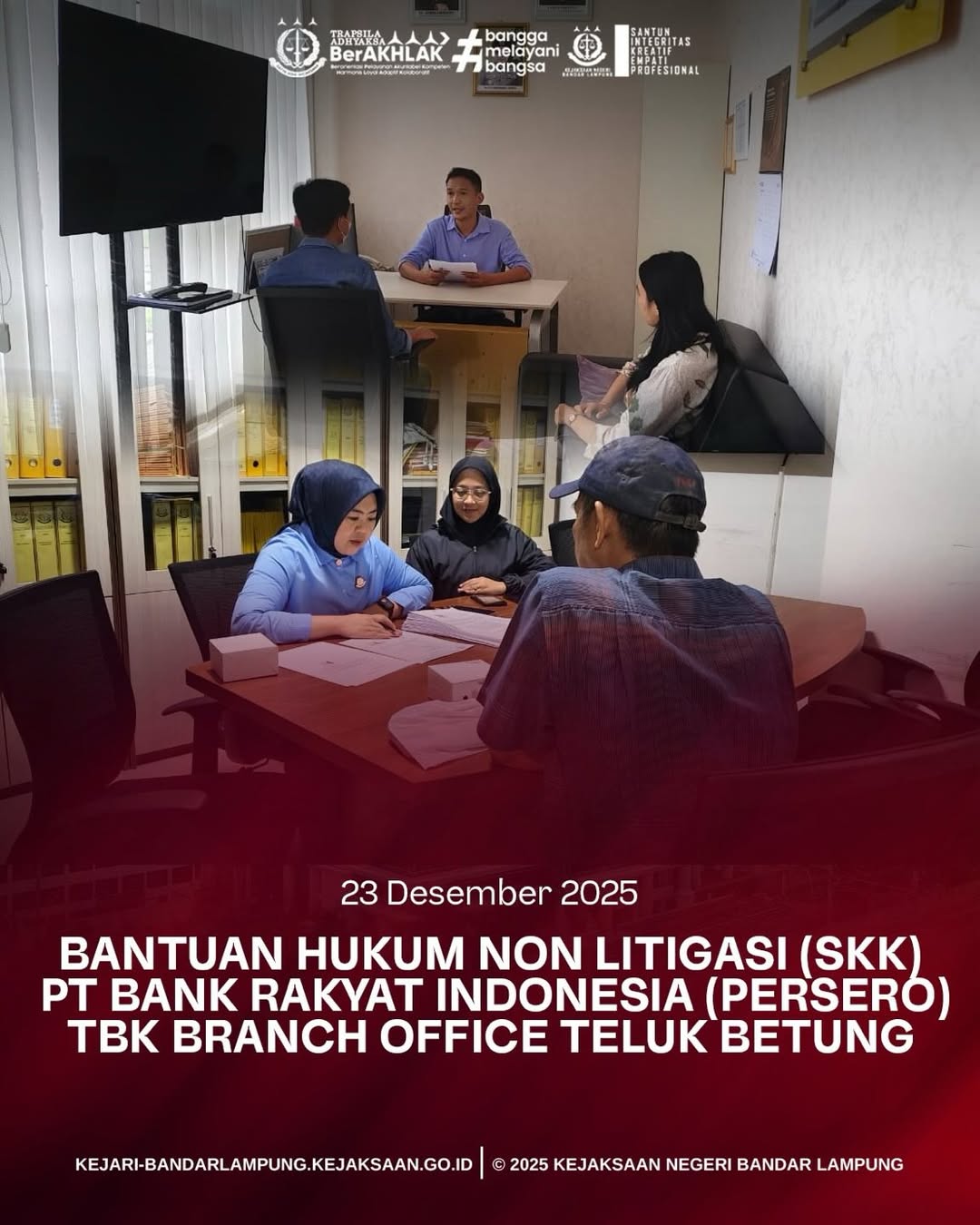 Kejaksaan Negeri Bandar Lampung Melaksanakan Bantuan Hukum Non Litigasi (SKK) PT BANK RAKYAT INDONESIA (PERSERO) TBK BRANCH OFFICE TELUK BETUNG, pada Selasa, 23 Desember 2025. Senin, 5 Januari 2026