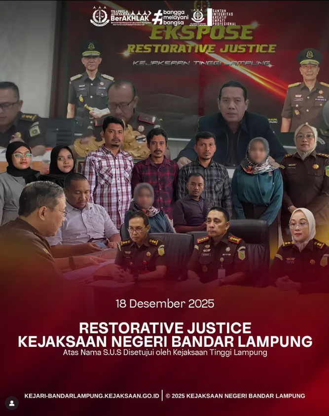 Kejaksaan Negeri Bandar Lampung melaksanakan Ekspose Penghentian Penuntutan Berdasarkan Keadilan Restoratif (Restorative Justice) terhadap perkara atas nama S.U.S., pada Kamis, 18 Desember 2025. Kamis, 18 Desember 2025