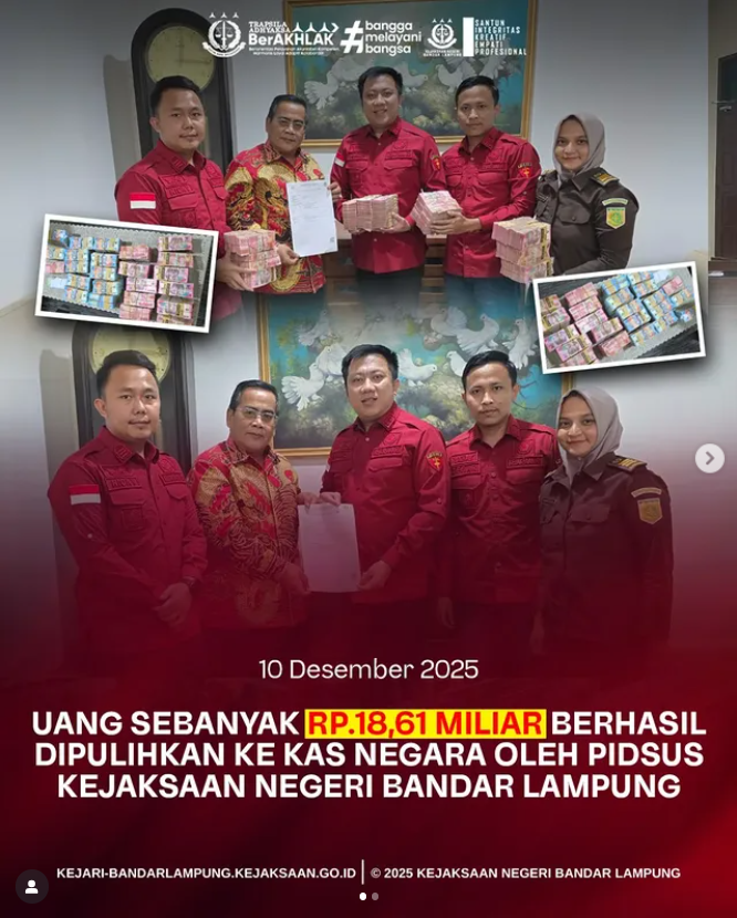 Uang Sebanyak RP,18,61 Miliar Berhasil Dipulihkan ke Kas Negara oleh Pidsus Kejaksaan Negeri Bandar Lampung Rabu, 10 Desember 2025