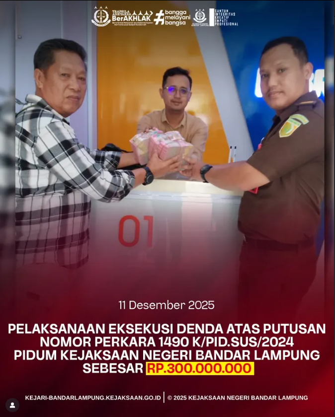 Eksekusi Pembayaran Denda Sebagaimana Amar Putusan Pengadilan Dengan Jumlah Sebesar Rp300.000.000 Kamis, 11 Desember 2025