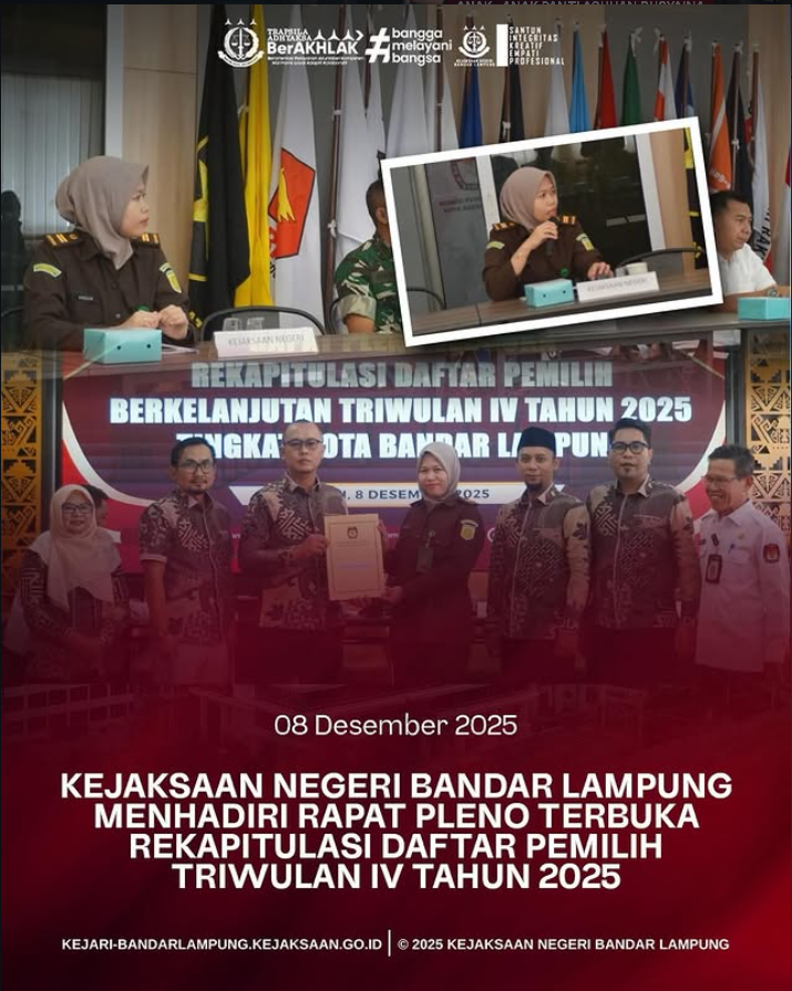 Kejaksaan Negeri Bandar Lampung menghadiri Rapat Pleno Terbuka Rekapitulasi Daftar Pemilih Berkelanjutan Triwulan IV Tahun 2025 tingkat Kota Bandar Lampung Senin, 8 Desember 2025