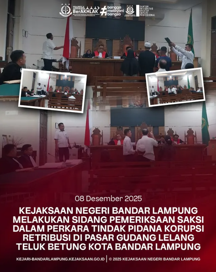 Kejaksaan Negeri Bandar Lampung melaksanakan agenda sidang pemeriksaan saksi dalam perkara Dugaan Tindak Pidana Korupsi Retribusi di Pasar Gudang Lelang Teluk Betung Kota Bandar Lampung Senin, 8 Desember 2025