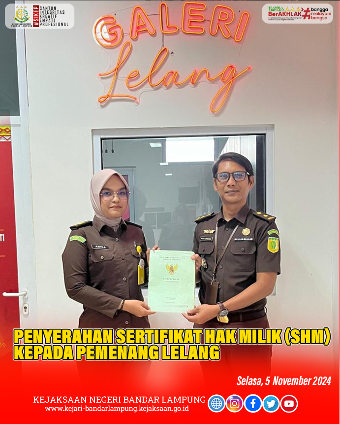 Seksi Pemulihan Aset dan Pengelolaan Barang Bukti atau selaku Penjual telah melakukan penyerahan Sertifikat Hak Milik (SHM) kepada Pembeli bertempat di Galeri Lelang Pemulihan Aset pada Kejaksaan Negeri Bandar Lampung Selasa, 5 November 2024