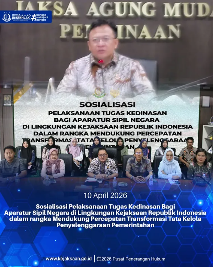 sosialisasi pelaksanaan tugas kedinasan bagi aparatur sipil negara di lingkungan kejaksaan republik indonesia dalalm rangka mendukung percepatan tranportasi tata pengelolah penyelenggaraan pemerintah Jumat, 10 April 2026