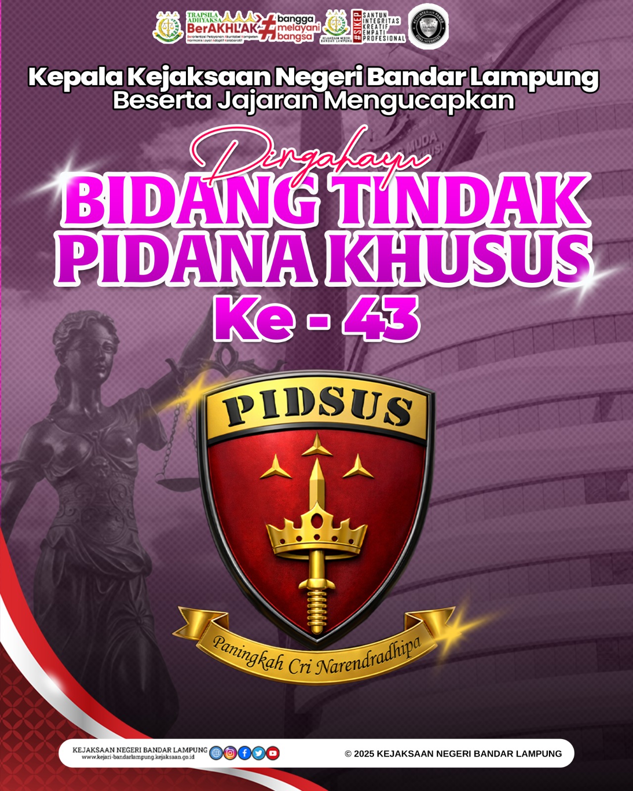 Kepala Kejaksaan Negeri Bandar Lampung Ucapkan Dirgahayu ke-43 Bidang Tindak Pidana Khusus (PIDSUS), Rabu 7 Januari 2025. Rabu, 7 Januari 2026