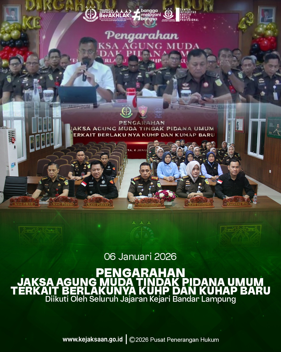 Kejaksaan Negeri Bandar Lampung Mengikuti Pengarahan Jaksa Agung Muda Tindak Pidana Umum Terkait Pemberlakuan KUHP dan KUHAP yang Baru, pada Selasa, 6 Januari 2026. Selasa, 6 Januari 2026