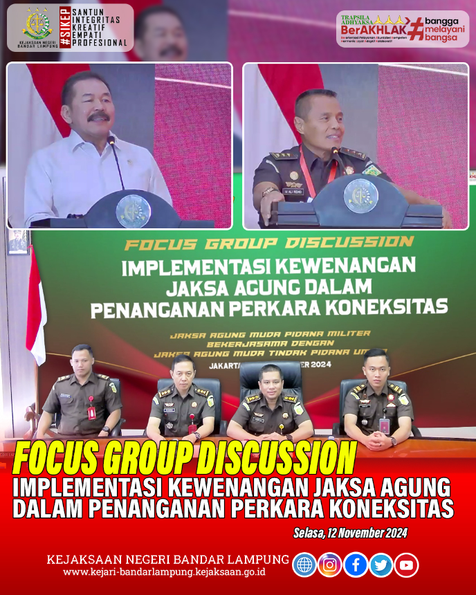 Kejaksaan Negeri Bandar Lampung mengikuti kegiatan Focus Group Discussion terkait Implementasi Kewenangan Jaksa Agung Dalam Penanganan Perkara Koneksitas secara Virtual Selasa, 12 November 2024