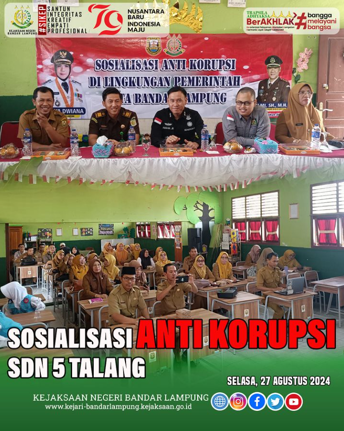 Selamat datang di website Kejaksaan Negeri Bandar Lampung. Anda berada di kawasan Zona Integritas menuju Wilayah Bebas dari Korupsi (WBK) dan Wilayah Birokrasi Bersih Melayani (WBBM). Ikuti akun media sosial kami di Instagram, Facebook, Twitter, dan YouTube untuk memperoleh informasi terbaru. Terima kasih atas kunjungan Anda. Salam SIKEP — Santun, Integritas, Kreatif, Empati, dan Profesional.