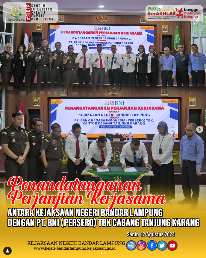Penandatanganan Perjajian Kerja Sama Dengan PT. BNI Kantor Cabang Tanjung Karang Senin, 12 Agustus 2024