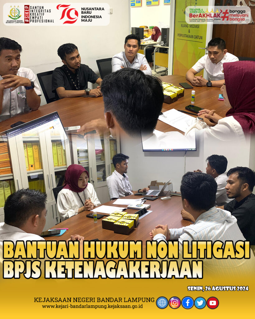 Bandar Lampung – Bidang Datun Kejaksaan Negeri Bandar Lampung, melaksanakan kegiatan Bantuan Hukum Non litigasi (SKK) BPJS Ketenagakerjaan Berupa mediasi dengan Badan Usaha yang menunggak, Senin (26/08/2024).