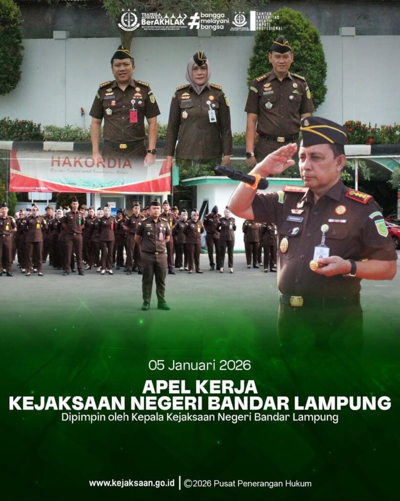 Kejaksaan Negeri Bandar Lampung melaksanakan Apel Kerja pada Senin, 05 Januari 2026, bertempat di halaman Kantor Kejaksaan Negeri Bandar Lampung. Kegiatan apel kerja ini dipimpin langsung oleh Kepala Kejaksaan Negeri Bandar Lampung dan diikuti oleh seluruh jajaran pejabat struktural, jaksa, serta pegawai tata usaha.