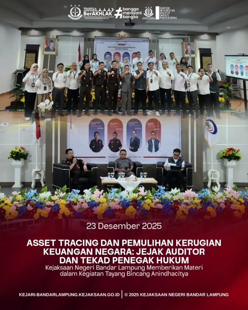 Kegiatan yang mengusung tema “Asset Tracing dan Pemulihan Kerugian Keuangan Negara: Jejak Auditor dan Tekad Penegak Hukum” ini bertujuan untuk memperkuat sinergi antara auditor dan aparat penegak hukum dalam upaya penelusuran aset serta pemulihan kerugian keuangan negara secara optimal. Melalui penyampaian materi tersebut, Kejaksaan Negeri Bandar Lampung menegaskan komitmennya dalam mendukung penegakan hukum yang profesional, berintegritas, dan berorientasi pada akuntabilitas pengelolaan keuangan negara.