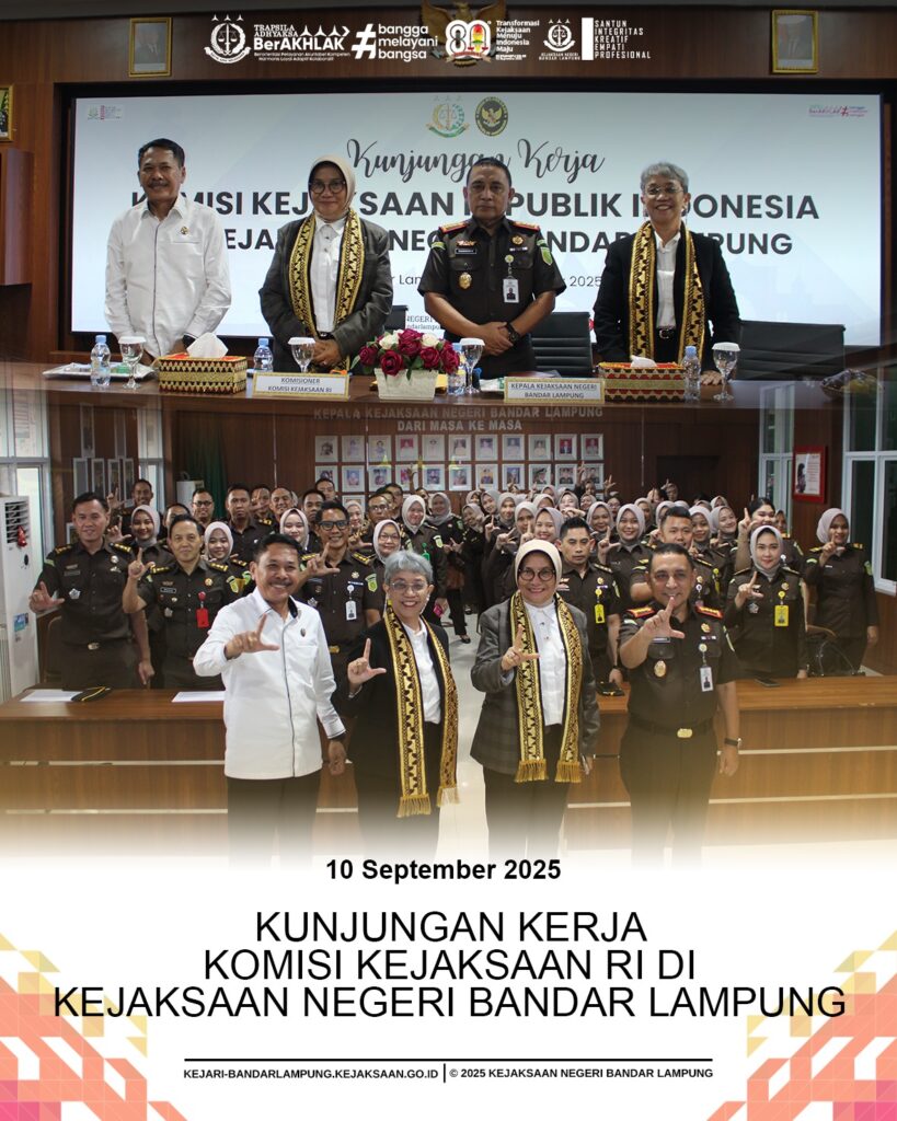 Kejaksaan Negeri Bandar Lampung menerima kunjungan kerja dari Komisi Kejaksaan Republik Indonesia. Kunjungan ini dilaksanakan dalam rangka menindaklanjuti laporan pengaduan masyarakat serta melakukan pemantauan terhadap tata kelola organisasi, kelengkapan sarana dan prasarana, serta kinerja satuan kerja kejaksaan.