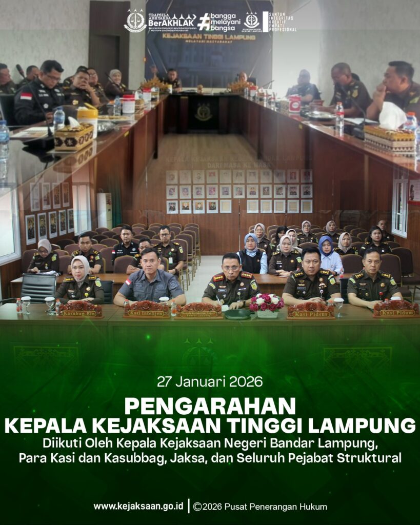 Kejaksaan Negeri Bandar Lampung mengikuti kegiatan pengarahan yang disampaikan oleh Kepala Kejaksaan Tinggi Lampung, yang diikuti oleh Kepala Kejaksaan Negeri Bandar Lampung bersama para Kepala Seksi, Kepala Subbagian Pembinaan, para Jaksa, serta seluruh pejabat struktural dan pegawai di lingkungan Kejaksaan Negeri Bandar Lampung.